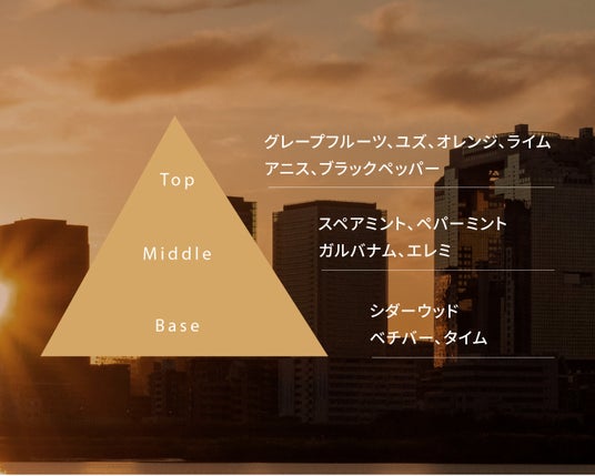 「TANGERINE SKY」は夜空に橙色の朝焼けが溶け込むように広がり、眠りから目覚めるような活力を感じる香り。