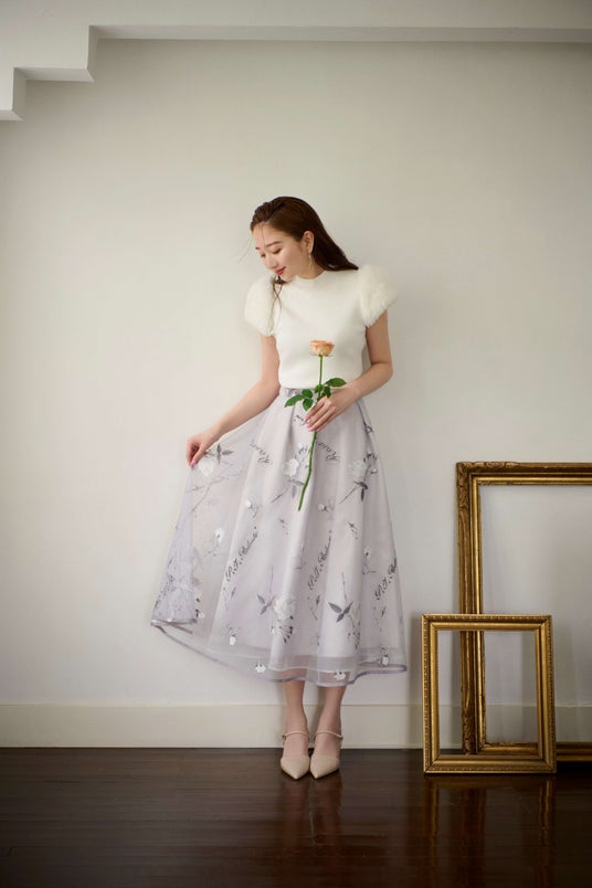 チュールに白糸やラメ糸で刺繍を施し、さらにプリントを重ねることで表情豊かな仕上がりに。