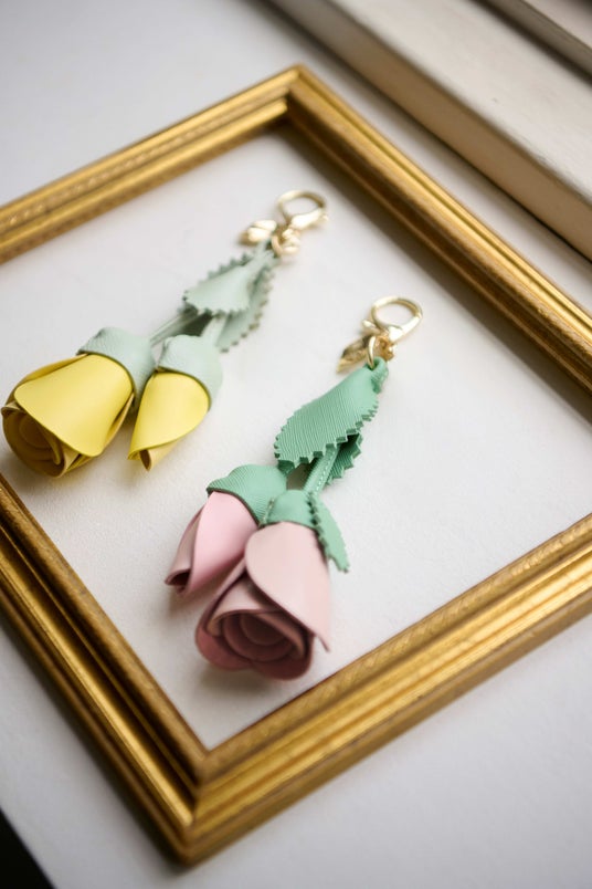 咲き開く前の奥ゆかしい薔薇を細部まで忠実に再現。ルドゥーテの絵にならって濃淡をつけ、葉っぱの形にもこだわりました。お手持ちのバッグにつけるだけで装いがぐっとエレガントに。