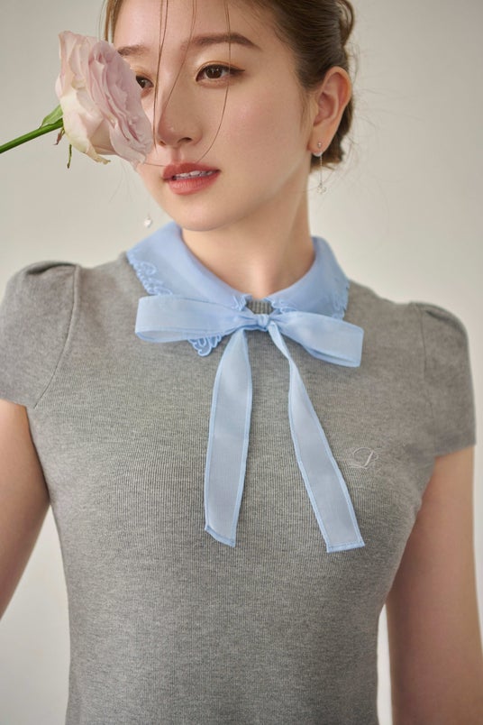 シアーなオーガンジー襟とリボンが優雅に揺れるニットプルオーバー。襟元には「Rosier du Cumberland」と「P.J. REDOUTE」の文字を刺繍し、胸元にも頭文字の「R」をあしらいました。肩回りを華奢に見せるキャップスリーブが女性らしい魅力を引き立てます。