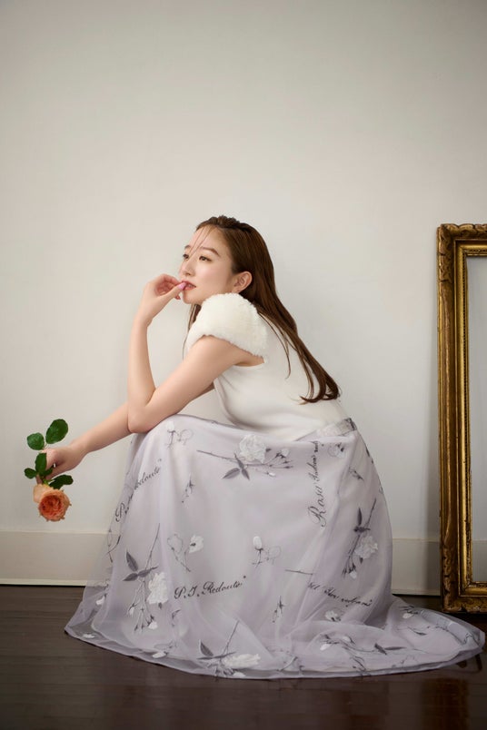 作品から抜け出したような花モチーフが目を引くニットカーディガン。チュール素材にルドゥーテの花をプリントし重ね合わせることで、たおやかな色彩と奥ゆきある質感を表現しています。