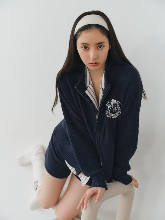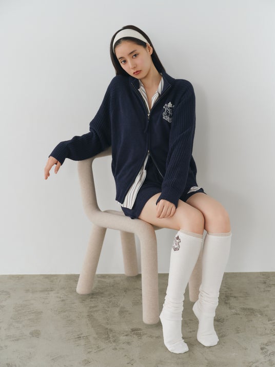 しっとりとした素材のニットを使用した、カレッジライクなニットウェアシリーズのコーディネート。スポーティな雰囲気のジップアップカーディガンは、SNIDEL HOMEオリジナルのエンブレムがアクセント。袖部分はざっくりとした編地に切り替え、ほんのり透け感のある風合いに仕上げました。