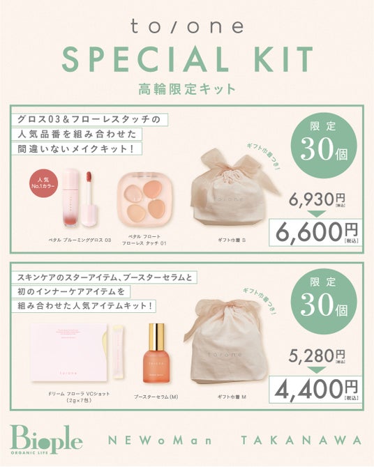 Biople ニュウマン高輪店のリニューアルオープンを記念して企画した、人気ブランド“to/one(トーン)”の限定キットが2種類登場!