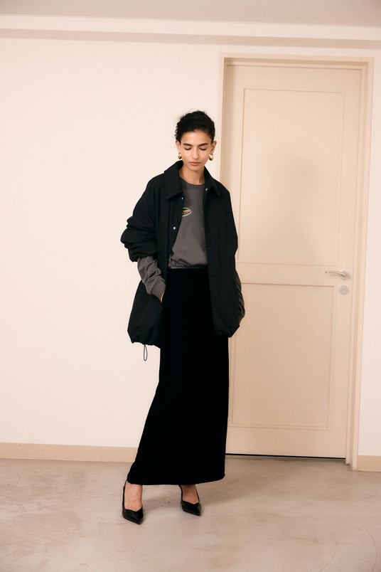 すっきりとした無駄のないシンプルなベロアのスカート。毛足のコシが強く、上品な光沢感があるアイテム。ウエストの合皮リボンでウエスト調整が出来つつ、垂らして合皮のエッジな雰囲気も見せることができます。