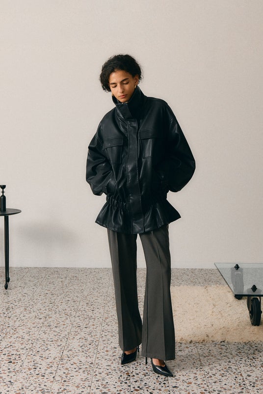 柔らかな合皮の素材を使用し、ペプラムのようなギャザーディテールを加え、バックスタイルに丸みのあるボリューミーなシルエットを作り出しました。衿は高めに設定してモードさをプラスしつつも、ちょっとした女性らしさも表現しています。