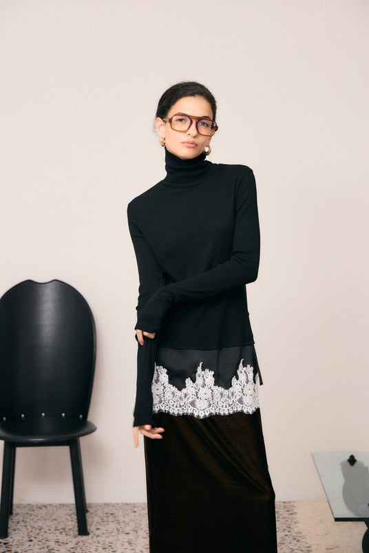 さらりとした大人っぽいカットテレコ素材の裾に、大判レースを叩きつけたサテン地をドッキング。シンプルの中に遊びのある一枚。一枚でも完成するアイテムでありながら、ニットやスウェットのインナーにして、裾のレースをアクセントにしたレイヤードスタイルにも活躍。