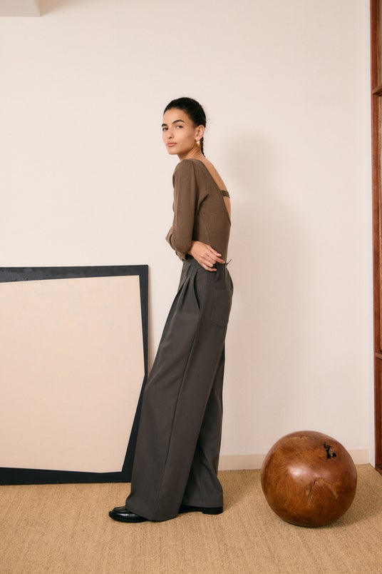 ヴィンテージショップにありそうなレトロな雰囲気のハイウエストのパンツ。敢えてウエストベルトを作らずに、ウエストに綺麗に沿うシルエットで、レトロかつ女性らしい品のある表情に。