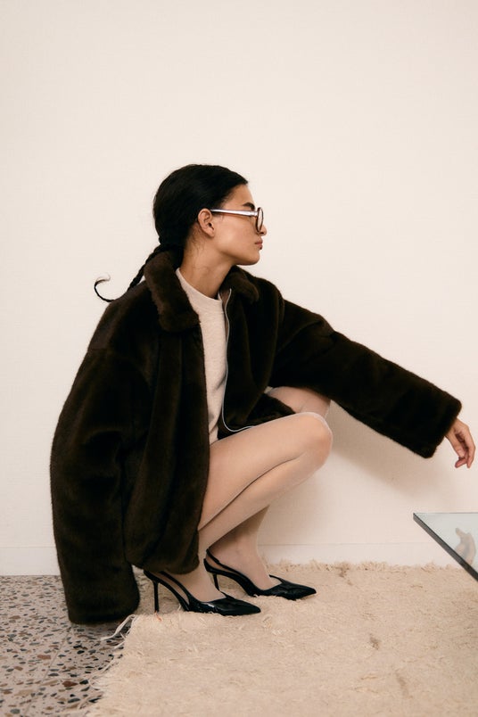 毛足の短い上品なエコファーを使用した、中綿入りのボンバージャケット風ブルゾン。裾にゴムスピンドルを内蔵しているので、絞ることでショート丈&よりボリューミーなシルエットに変化。可愛らしいだけではなく、少しメンズライクな印象に。