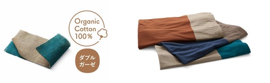 素材はオーガニックコットンを使用した、薄くて軽いダブルガーゼ。デザインは、〈ココナツベージュ〉〈ラグーンネイビー〉〈サンセットオレンジ〉の3種類です。薄手なのでコンパクトに持ち運びできて、ジムや旅行のお供にもおすすめです。