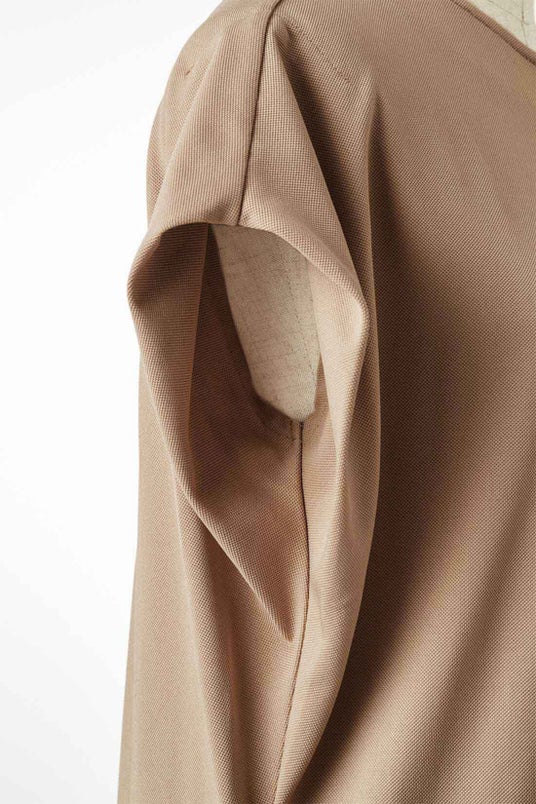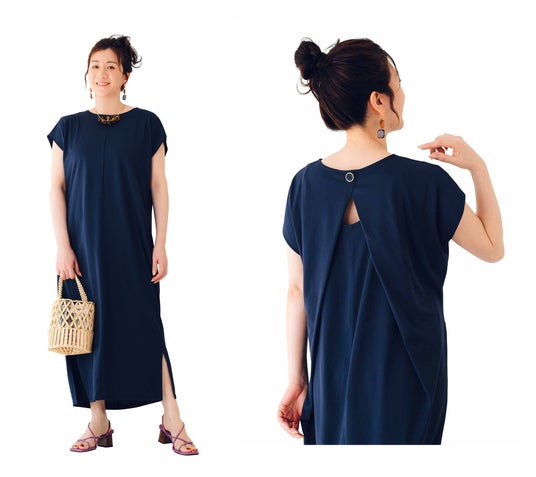 「おしゃれに我慢はいらんやん!」をコンセプトに、“お悩み番長”こと野々村友紀子さんといっしょにつくったワンピース。涼しく過ごしたいけど気になる部分を隠したい……そんなきれいとらくちんを両立する“後ろ姿”の肌見せがポイント。気になる肩と腕はフレンチスリーブでカバーしながらも、程よく肌を見せることですっきりと見せてくれます。一枚でもパンツとのレイヤードでもサマになる、着回し力のある一着です。