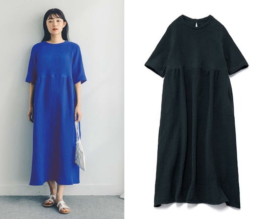 ほどよく厚みのあるトリプルガーゼだから一枚着でも安心できるワンピース。まるっと体形を隠せるゆったりシルエットを、腰高の切り替えでメリハリのある表情に。コーディネートの華やかなアクセントになる鮮やかなブルーとシックなダークグレーの2色展開です。