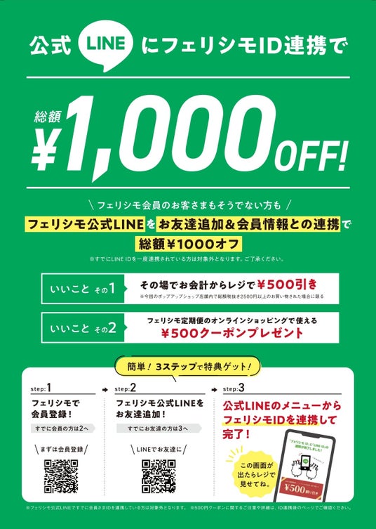 今回のポップアップショップでは、フェリシモ公式LINEにフェリシモ会員IDと連携した方を対象に「店頭で500円OFF」に加え、「オンラインショッピングで使える500円OFFクーポン」のプレゼントを実施します。