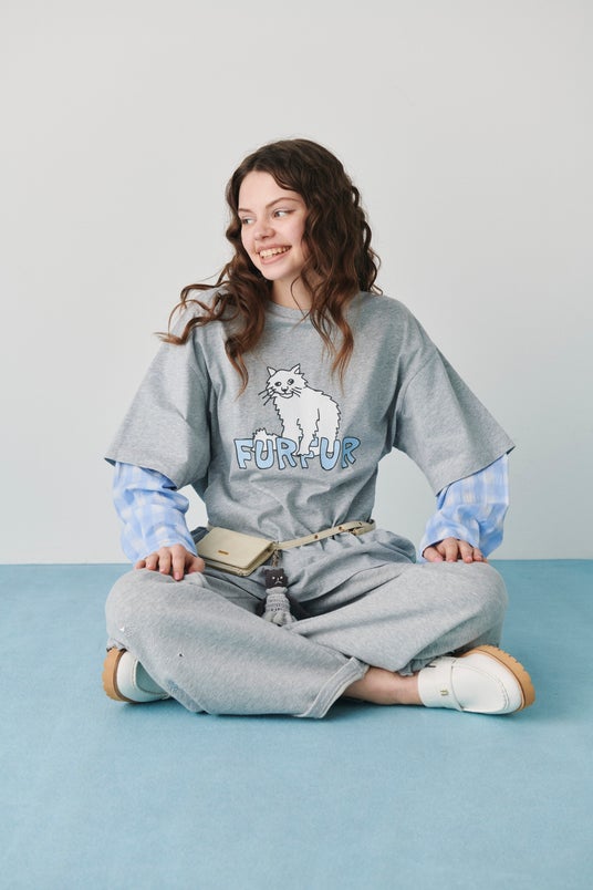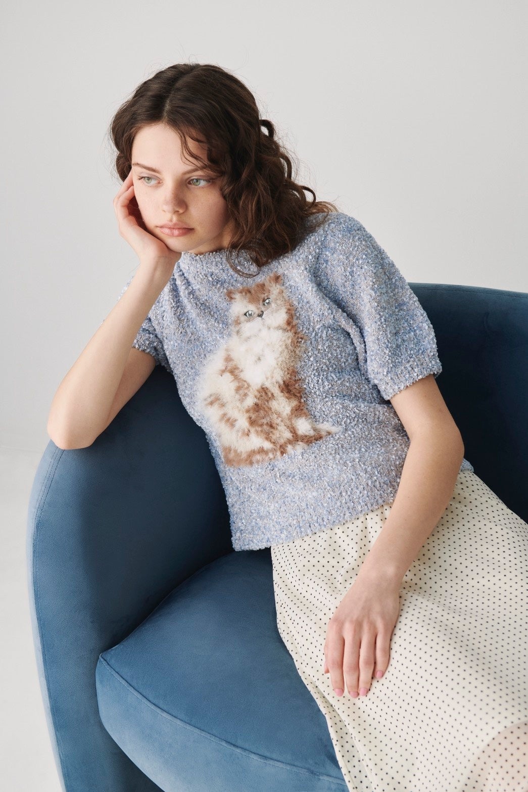 すまし顔の猫の表情がどこかユーモラスな印象を生む1着です。