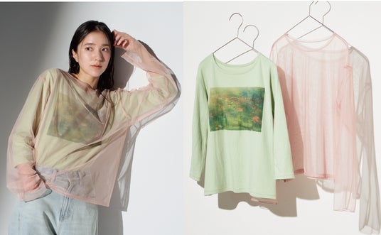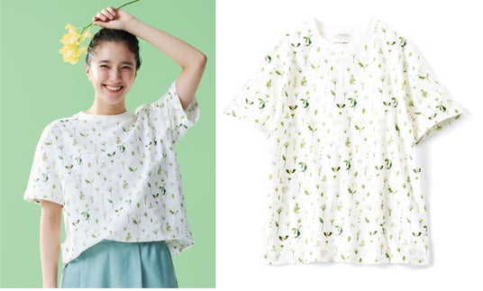 「地球の美しさに気づく感性を、心に届けたい」。そんな想いを込めて、フォトグラファー永瀬沙世さんが草花を撮り下ろし、プリントに落とし込んだTシャツです。フィルターを通したような、やわらかく安心した日々の風景をイメージしたチュール素材のレイヤードトップスをセットにしました。
