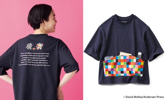 『ぞうのエルマー』とコラボした、平和の願いを込めたTシャツです。「ありのままの自分を受け入れ、喜びを分かち合う」というテーマをもとに、カラフルなモザイク柄のポケットをフロントにあしらい、文庫本やペットボトルが入る便利な仕様です。バックには『エルマーとまいごのくま』の一場面をプリントし、エルマーとともに特別な思いをまとえる一枚です。