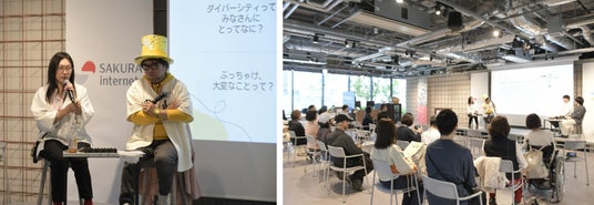 フェリシモ・オールライト研究所の筧麻子が、株式会社ここにある代表取締役・藤本遼氏をファシリテーターに迎え、PLAYWOKS株式会社代表・タキザワケイタ氏、NPO法人月と風と代表理事・清田仁之氏とともに壇上にて、約60分間、トークセッションを行いました。それぞれの活動のスタートのきっかけを紹介、活動についてのやりがい・エピソード、ダイバーシティについての考えを語るほか、参加者からの想いを会場全体で共有しあうなど、なごやかな雰囲気で行われました。