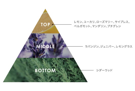 レモン、ユーカリ、ローズマリー、ベルガモット、カモミールなど13種の精油をブレンドした