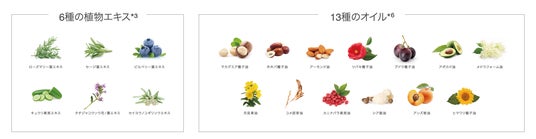 ローズマリー、セージ、ビルベリーなどの6種の植物エキス*³と、ホホバオイル、米ぬか、シアバターなど13種*⁶のオイルを厳選配合。