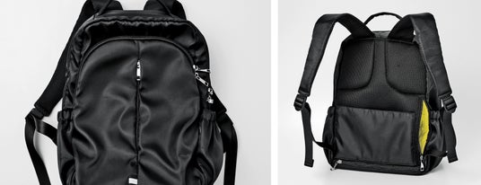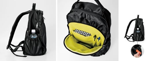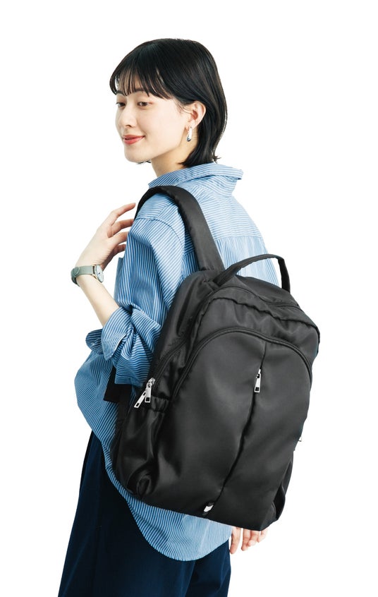 毎日使うものだから、使い勝手にもこだわりが満載。撥水加工生地を使用し、フロントには片方の肩にかけたままアクセスしやすい縦開きのファスナーポケットや夜道で光を反射するリフレクター機能つきタブをつけました。サイドポケットにはかぎやパスケースをつないでおけるDカンつき。背面には貴重品を入れられるファスナーポケットや、ひざの上にリュックを置いたときにスマホなどの手荷物の一時置きとして便利なポケットが。肩甲骨付近はクッションを重ねて厚くしてからだ当たりをやさしくしています。