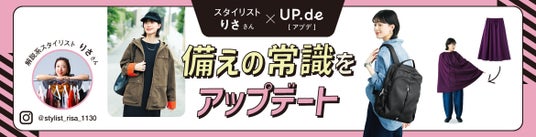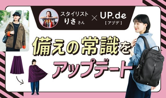 フェリシモが展開するブランド「UP.de[アプデ]」は、スタイリスト・りささんとコラボレーションした防災視点のファッションアイテムを、7月23日に発売します。ラインナップは、非常時に着替えやトイレの目隠しになる「撥水ロングスカート」、一日分の防災ポーチを入れっぱなしにできる「多機能リュック」、貴重品や防災グッズを5つのポケットですっきり収納できる「着られるバッグ(R)ジャケット」の3種類。いずれも日常で使いやすいデザインと、災害時に役立つ機能を両立したアイテムです。