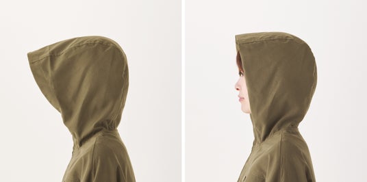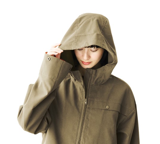 フードはプライバシーの確保にひと役。深くかぶれば男女の区別もつきにくく、人目が気になる場所でもパーソナルスペースをつくりやすくなります。フードのボタンを外すと、目もとまで隠れる大きなサイズに変身。屋外での日差し対策や、すっぴん隠しにもお役立ちです。