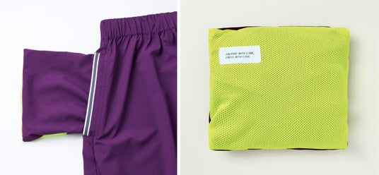 スカートの表地は避難所などで性別を目立たせないようなダークトーン。ポケッタブルにしたときに見えるメッシュ生地は、あえて気分が上がるネオンカラーで組み合わせています。ポケット口にはリフレクターリボンのアクセントが。暗い場所で光を受けるとピカッと反射します。