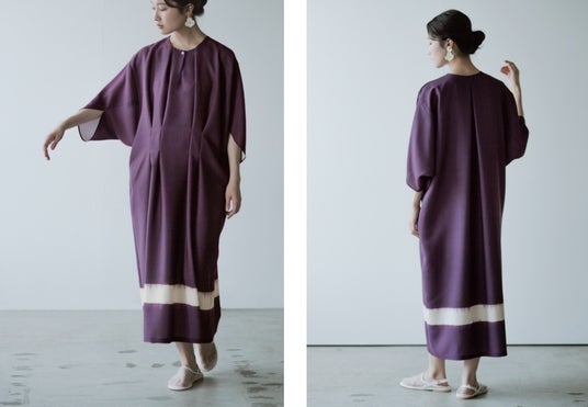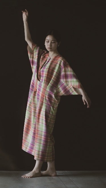 志村ふくみさんが織りためた裂の中から、アトリエシムラ監修のもとel:ment がデザインしたテキスタイルで、ワンピースを仕立てました。生地に用いたトリアセテート繊維は、日本でのみ生産され、ブラックフォーマルにも用いられる高級服地の繊維。絹のような光沢と滑らかさ、美しいドレープ性が特徴です。からだの立体感に合わせたタックが、動くたび美しいドレープを生み出す様は、どこか着物を思わせます。生地、プリント、縫製まですべて日本製にこだわりました。