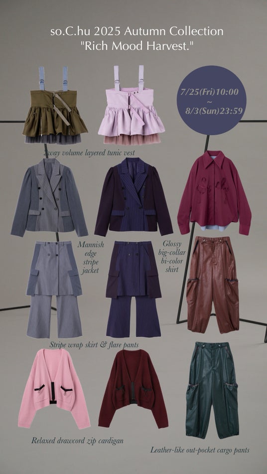 今回のコンセプトは、"Rich Mood Harvest.ー秋の実りをまとうご褒美ー“。ジャケット(2色)、スカートパンツ(2色)、 カーディガン(2色)、チュニックベスト(2色)、カーゴパンツ(2色)、シャツ(1色)をご用意しております。