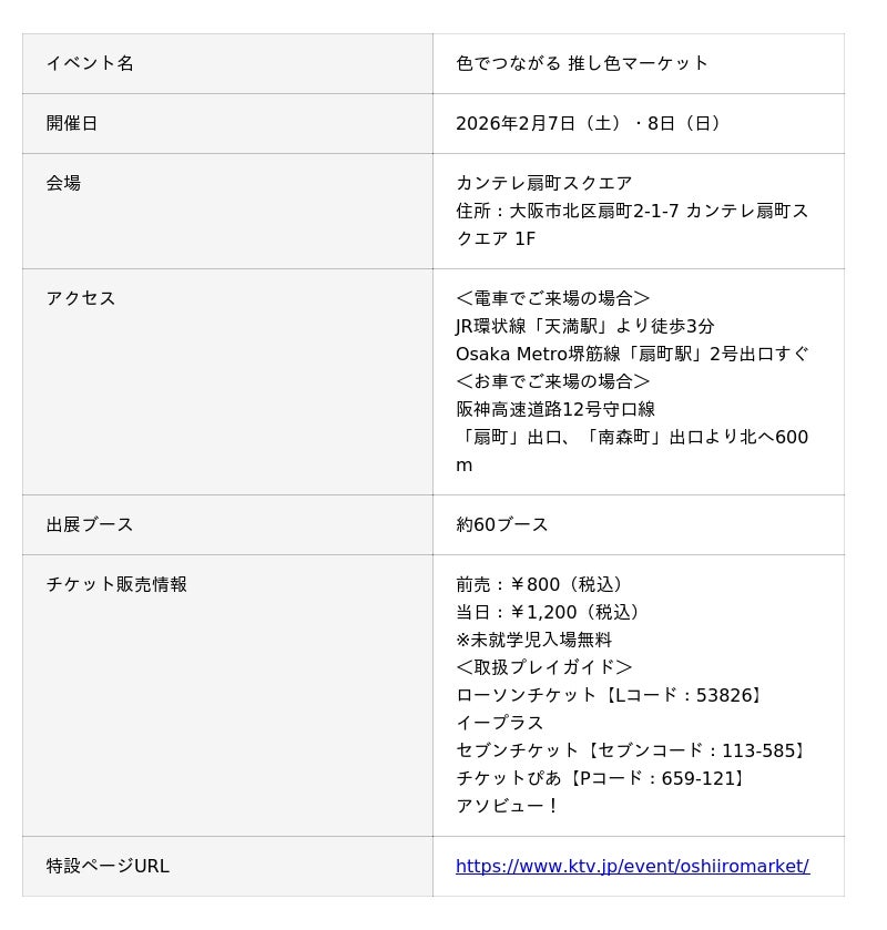 GMOインターネットグループのGMOペパボ株式会社(代表取締役社長:佐藤 健太郎)が運営する国内最大(※1)のハンドメイドマーケット「minne(ミンネ) byGMOペパボ」(URL:https://minne.com/)は、関西テレビ放送株式会社(代表取締役社長:岡 宏幸、以下、関西テレビ)と共同し、2026年2月7日(土)・8日(日)に大阪・カンテレ扇町スクエアで、推し色をテーマにしたイベント『色でつながる 推し色マーケット』(URL:https://www.ktv.jp/event/oshiiromarket/)を開催します。