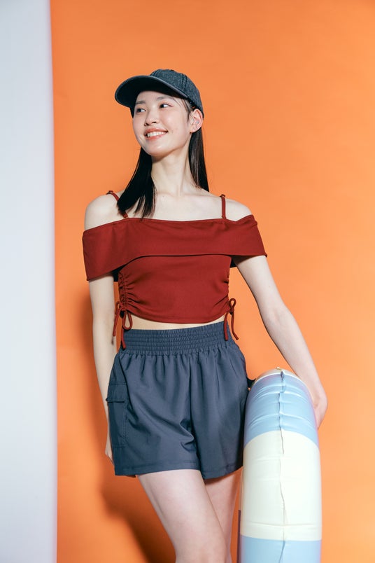 大人見え水着 リブオフショルダービキニ 3点セットリブ素材のショート丈トップスに布帛(ふはく)素材のカーゴパンツを組み合わせたアイテムです。トップスは胸の折り返しと脇のドロストがポイントです。
