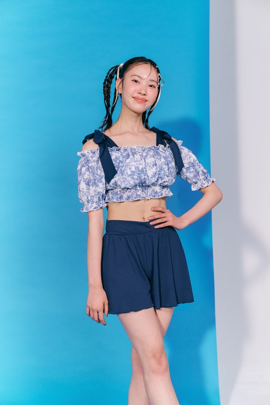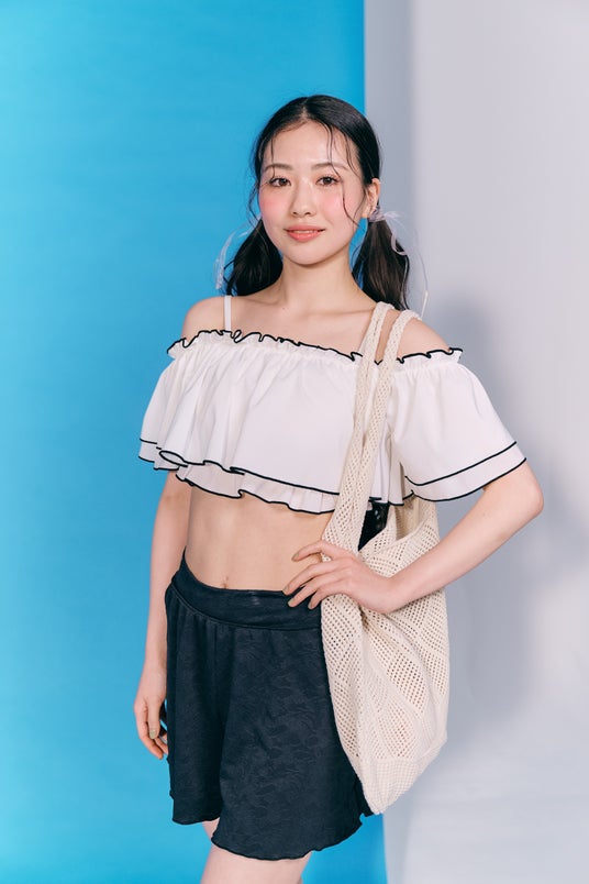 水着では、肌の露出が少なくアパレル感覚で着られるデザインがトレンドです。当社では、シアー素材やリボンなどで可愛いらしさと上品さを表現した“バレエコア”スタイルを提案しています。他に、落ち着いた配色や素材で、大人っぽさを表現した“大人見え”水着も展開します。