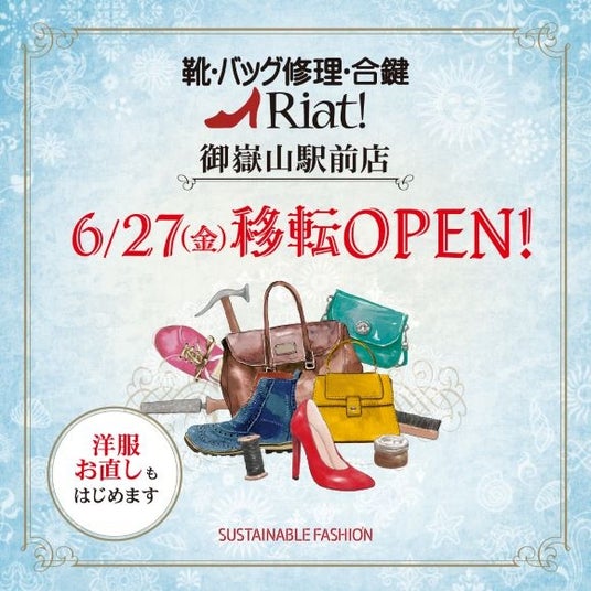 洋服・バッグのお直しを行う「マジックミシン」、靴・バッグの修理を行う「リアット!」など全国に668 店舗(2025年2月末現在)を展開する、イオングループのリフォームスタジオ株式会社(以下当社、本社:千葉県千葉市美浜区、代表取締役社長:齊藤岳彦)は、リアット!御嶽山駅前店を2025年6月27日(金)に移転オープンいたします。