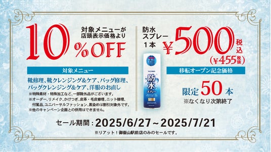 対象メニュー:靴修理、靴クレンジング&ケア、バッグ修理、バッグクレンジング&ケア、洋服のお直し。