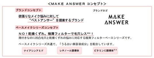 凹凸毛穴、乾燥やテカリ肌など、お肌の悩みは人それぞれで、化粧や美容へのお客さまのニーズは多様化しています。この度、どの年代の方にも、メイクの楽しさを知ってもらい、ポジティブに、自分に自信をもって毎日を過ごして欲しいという思いから、新ブランド「MAKE ANSWER(メイクアンサー)」を立ち上げました。