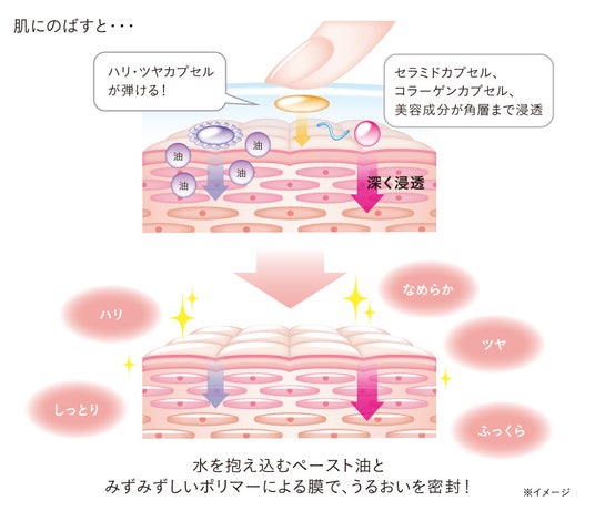 ※3:ハリ感をあたえるカプセル〔パンテノール・カラギーナン・カンテン・酸化鉄〕、セラミドカプセル〔セラミド NG・ステアロイルメチルタウリン Na・水添レシチン・オレイル酸エチル (エモリエント)〕、 コラーゲンカプセル 〔水溶性コラーゲ ンコレステロール・水添レシチン・ミリスチン酸イソプロピル (エモリエント)〕