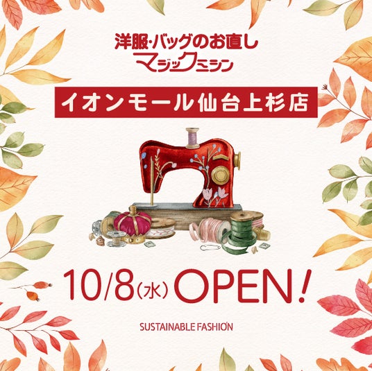 洋服・バッグのお直しを行う「マジックミシン」、靴・バッグの修理を行う「リアット!」など全国に668 店舗(2025年2月末現在)を展開するイオングループのリフォームスタジオ株式会社(本社:千葉県千葉市美浜区、代表取締役社長:齊藤岳彦)は、マジックミシンイオンモール仙台上杉店を2025年10月8日(水)にオープンいたします。