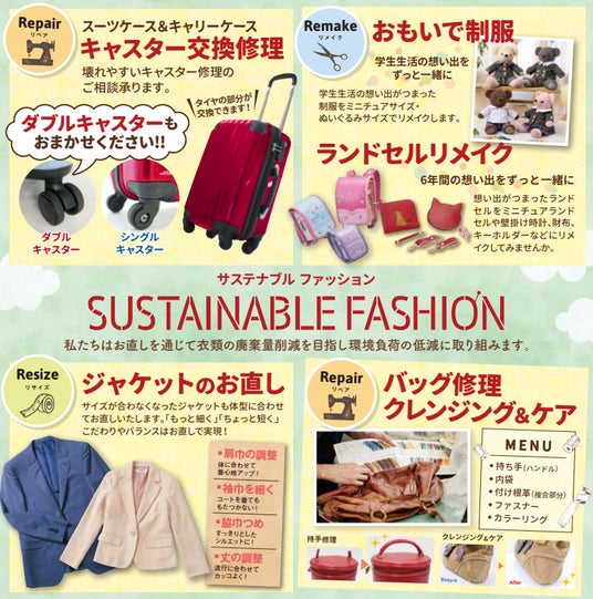 洋服のお直し、バッグ修理・バッグクレンジング&ケア、ランドセルリメイク、おもいで制服、きものリメイク、入園入学グッズ、ユニバーサルファッション、ペット服、衣装、スーツケースのキャスター交換修理。