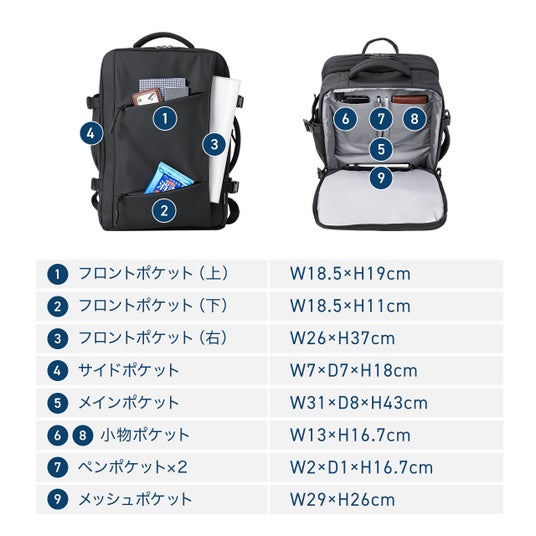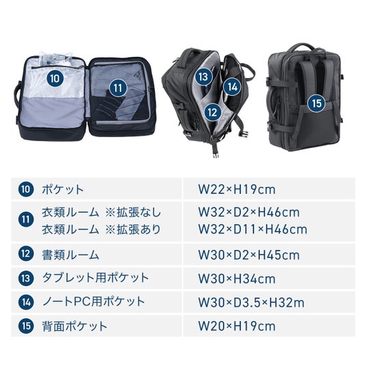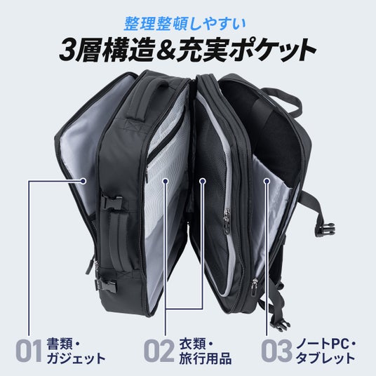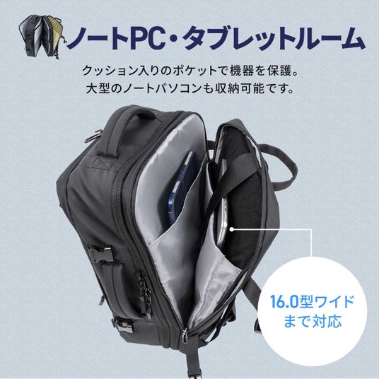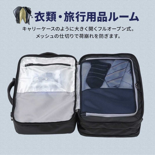 ●大きく開くメインの衣類・旅行用品ルーム、ポケットが充実の書類・ガジェットルーム、PC・タブレットルームがあります。