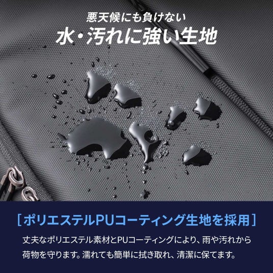 ●表面がPUコーティング生地を採用しており、雨や汚れから荷物を守る耐水性能。また手触りがよく高級感のある見た目です。