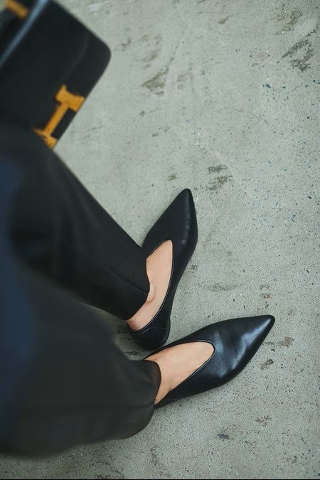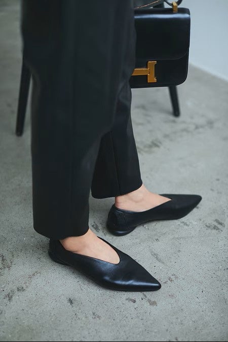 福田麻琴さんの目を惹きつけたのは、甲にU字のスリットが施されていて、さり気なくモードな雰囲気が漂うデザイン。「ポインテッドパンプスはつま先が痛くなってしまうものも多いですが、これはレザーがとっても柔らかく足に優しく馴染んで、シャープに見えるのに疲れ知らず。お仕事にもカジュアルにもマッチするので、ミモレ世代の「毎日シューズ」として是非おすすめしたいです!」とその魅力を語ります。