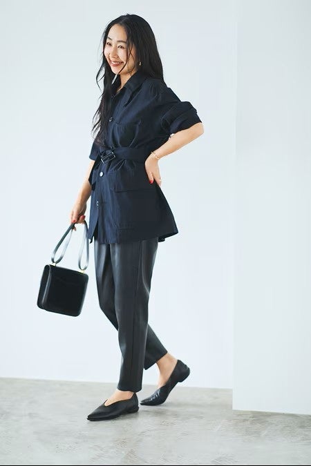 お仕事シーンではジャケット×パンツの装いに合わせて。 シンプルコーデにこのパンプスがモダンなアクセントになってくれる。