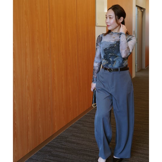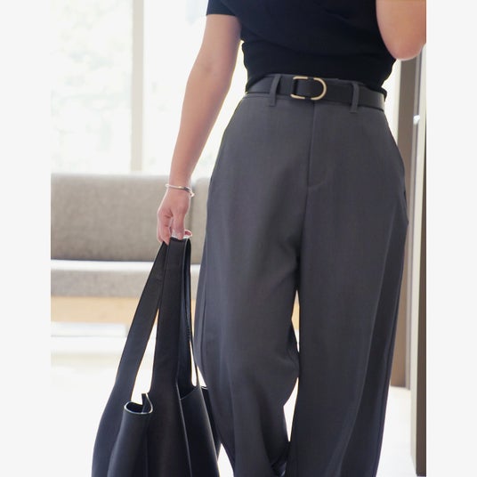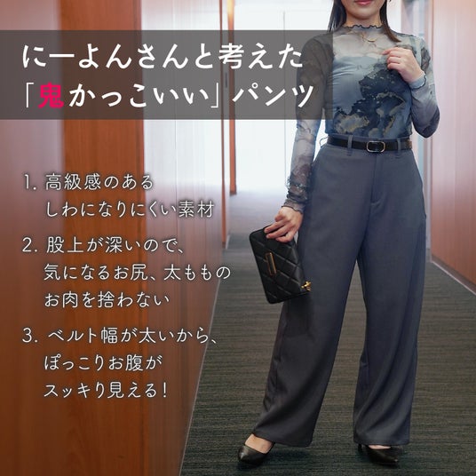 パンツの股上を深く作ることで、お尻や太もものお肉を拾わないデザインに。気になるぽっこりお腹は、太めにとったベルト幅でカバーして、スッキリ見せを叶えます。さらに生地には光沢感のあるしわになりにくい素材を使用し、高級感と動きやすさを両立させました。