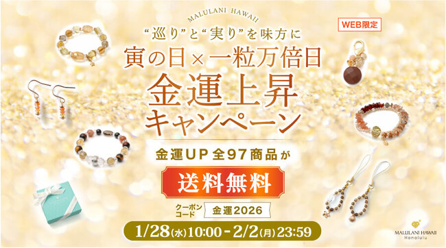 H1GLOBAL株式会社ハワイ発祥の天然石アクセサリーブランド「マルラニハワイ」は、1月28日・1月29日の吉日にあわせ、公式オンラインショップにて「金運アイテム 送料無料キャンペーン」を開催い...