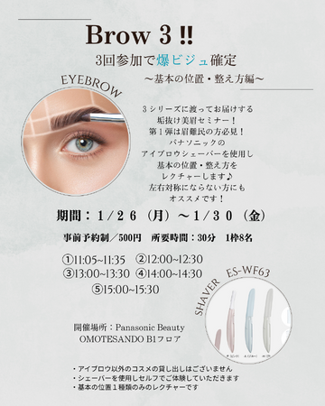 パナソニック株式会社2025年1月26日(月)~1月30日(金)の5日間、眉の基本をマンツーマン感覚で学べる垢抜け美眉セミナー「Brow 3!!」(全3回開催)の第1弾として『基本の位置・整え方...