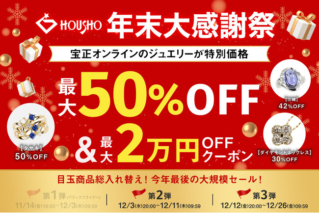 株式会社宝正高品質なダイヤモンド・真珠など中古ジュエリーを取り扱う株式会社宝正(ホウショウ)は、公式オンラインショップ「宝正オンライン」にて、12月3日~26日の期間「年末大感謝祭」を開催します...