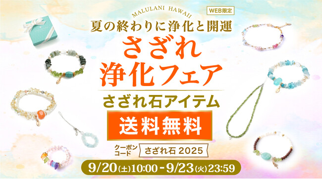 H1GLOBAL株式会社ハワイ発祥の天然石アクセサリーブランド「マルラニハワイ」では、このたび 「さざれ石」を使用した対象アイテムが送料無料になるキャンペーンを、9月20日(土)10:00から9...