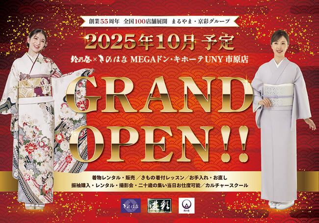 まるやま・京彩グループ日本の伝統美「着物」を、お買い物の合間に気軽にご覧いただける空間として「鈴乃屋×きのはな市原店」がMEGAドン・キホーテUNY市原店2階に新規オープンいたします。多くの世代...