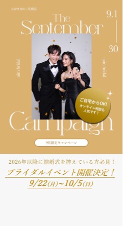 有限会社三景スタジオ北海道札幌市のウエディングフォトスタジオ、aim札幌店の9月のキャンペーン、フェア情報をお届けいたします!フォトウェディングの際のお得情報やソロウェディングキャンペーンもご紹...