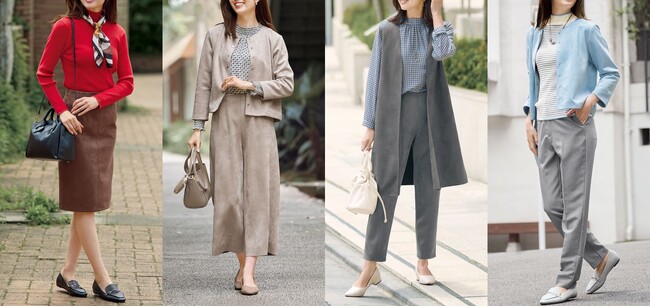 株式会社ニトリホールディングス左からストレッチスウェード調スカート(ブラウン)、カーディガン・セミワイドパンツ(モカ)、ロングジレ・テーパードパンツ(チャコールグレー)、カーディガン(ブルー)ニ...