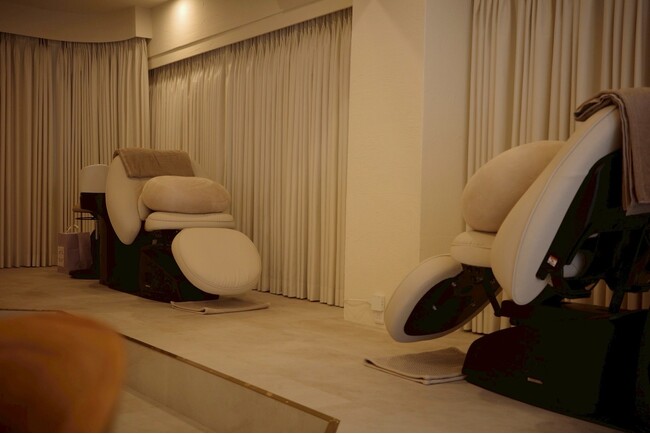 株式会社アウタ一度に一組だけ。旅行の記念日やハネムーンに、英語対応の完全貸切ヘッドスパ。「2台並びのリクライニング・シャンプー台。ペア施術に最適」 / Dual reclining shampo...